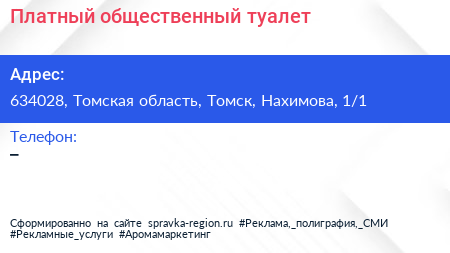 Платный общественный туалет по адресу 634028, Томская область, Томск, Нахимова, 1/1 в дальнейшем Организация, размещена в следующих категориях: