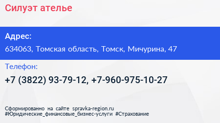 Силуэт, ателье по адресу 634063, Томская область, Томск, Мичурина, 47 в дальнейшем Организация, размещена в следующих категориях: