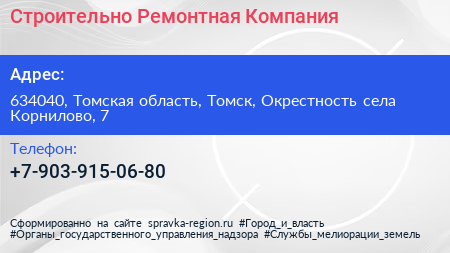 Строительно-Ремонтная Компания по адресу 634040, Томская область, Томск, Окрестность села Корнилово, 7 в дальнейшем Организация, размещена в следующих категориях: