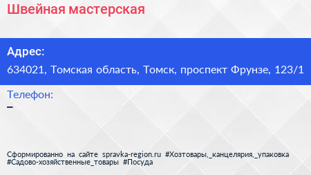 Швейная мастерская по адресу 634021, Томская область, Томск, проспект Фрунзе, 123/1 в дальнейшем Организация, размещена в следующих категориях: