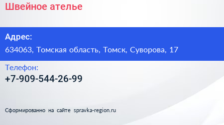 Швейное ателье по адресу 634063, Томская область, Томск, Суворова, 17 в дальнейшем Организация, размещена в следующих категориях: