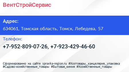 ВентСтройСервис по адресу 634061, Томская область, Томск, Лебедева, 57 в дальнейшем Организация, размещена в следующих категориях: