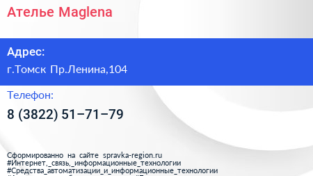Ателье «Maglena» по адресу г.Томск Пр.Ленина,104 в дальнейшем Организация, размещена в следующих категориях: