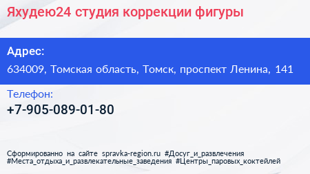 Яхудею24, студия коррекции фигуры по адресу 634009, Томская область, Томск, проспект Ленина, 141 в дальнейшем Организация, размещена в следующих категориях: