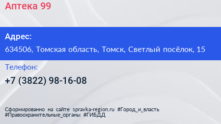Аптека №99 по адресу 634506, Томская область, Томск, Светлый посёлок, 15 в дальнейшем Организация, размещена в следующих категориях: