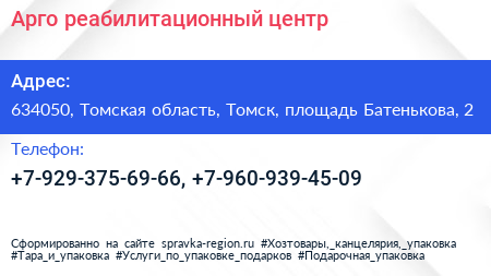 Арго, реабилитационный центр по адресу 634050, Томская область, Томск, площадь Батенькова, 2 в дальнейшем Организация, размещена в следующих категориях:
