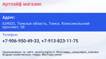 Артлайф, магазин по адресу 634021, Томская область, Томск, Комсомольский проспект, 58 в дальнейшем Организация, размещена в следующих категориях: