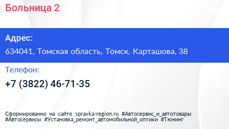 Больница №2 по адресу 634041, Томская область, Томск, Карташова, 38 в дальнейшем Организация, размещена в следующих категориях: