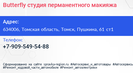 Butterfly, студия перманентного макияжа по адресу 634006, Томская область, Томск, Пушкина, 61 ст1 в дальнейшем Организация, размещена в следующих категориях: