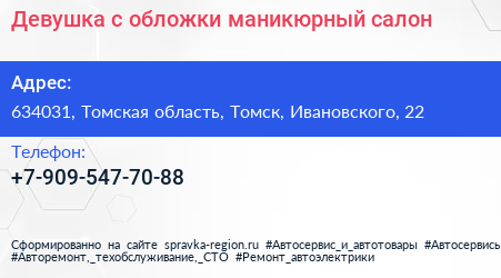 Девушка с обложки, маникюрный салон по адресу 634031, Томская область, Томск, Ивановского, 22 в дальнейшем Организация, размещена в следующих категориях: