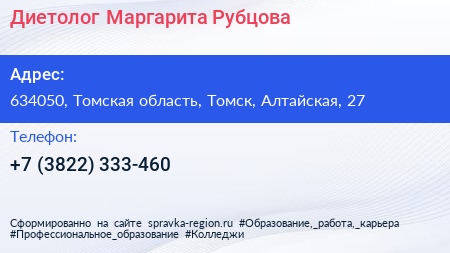 Диетолог Маргарита Рубцова по адресу 634050, Томская область, Томск, Алтайская, 27 в дальнейшем Организация, размещена в следующих категориях: