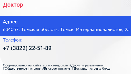 Доктор по адресу 634057, Томская область, Томск, Интернационалистов, 2а в дальнейшем Организация, размещена в следующих категориях: