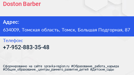 Doston Barber по адресу 634009, Томская область, Томск, Большая Подгорная, 87 в дальнейшем Организация, размещена в следующих категориях: