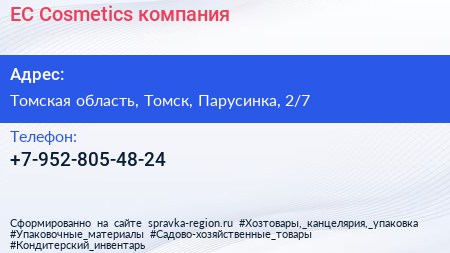 EC Cosmetics, компания по адресу Томская область, Томск, Парусинка, 2/7 в дальнейшем Организация, размещена в следующих категориях: