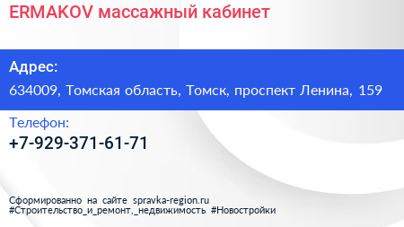 ERMAKOV, массажный кабинет по адресу 634009, Томская область, Томск, проспект Ленина, 159 в дальнейшем Организация, размещена в следующих категориях: