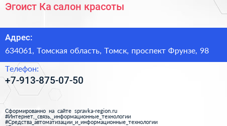 Эгоист.Ка, салон красоты по адресу 634061, Томская область, Томск, проспект Фрунзе, 98 в дальнейшем Организация, размещена в следующих категориях: