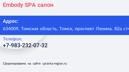 Embody, SPA-салон по адресу 634009, Томская область, Томск, проспект Ленина, 82а ст4 в дальнейшем Организация, размещена в следующих категориях: