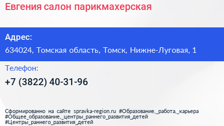 Евгения, салон-парикмахерская по адресу 634024, Томская область, Томск, Нижне-Луговая, 1 в дальнейшем Организация, размещена в следующих категориях: