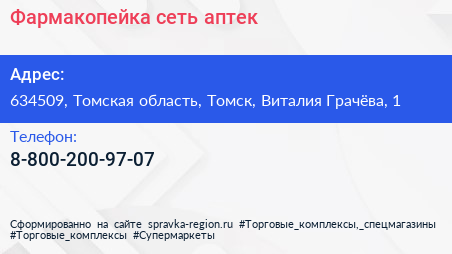Фармакопейка, сеть аптек по адресу 634509, Томская область, Томск, Виталия Грачёва, 1 в дальнейшем Организация, размещена в следующих категориях: