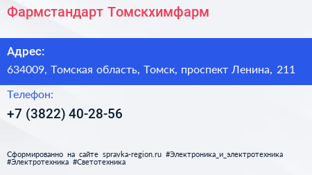 Фармстандарт-Томскхимфарм по адресу 634009, Томская область, Томск, проспект Ленина, 211 в дальнейшем Организация, размещена в следующих категориях: