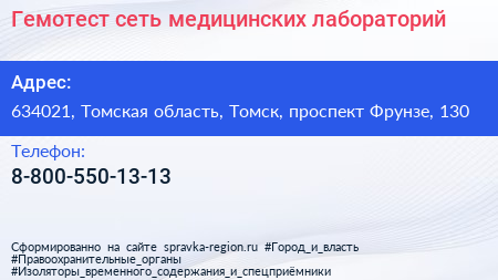 Гемотест, сеть медицинских лабораторий по адресу 634021, Томская область, Томск, проспект Фрунзе, 130 в дальнейшем Организация, размещена в следующих категориях: