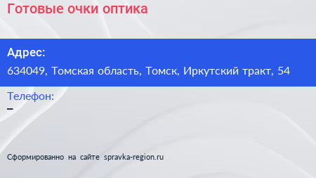 Готовые очки, оптика по адресу 634049, Томская область, Томск, Иркутский тракт, 54 в дальнейшем Организация, размещена в следующих категориях: