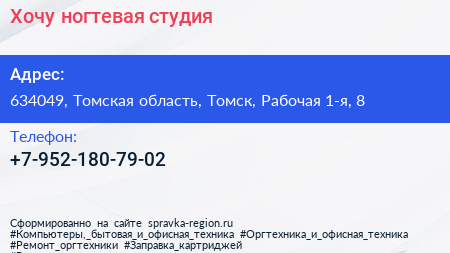 Хочу, ногтевая студия по адресу 634049, Томская область, Томск, Рабочая 1-я, 8 в дальнейшем Организация, размещена в следующих категориях:
