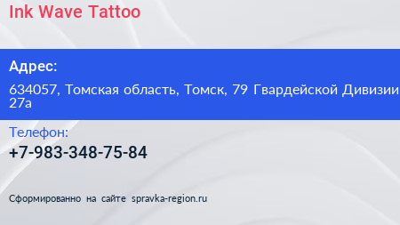 Ink Wave Tattoo по адресу 634057, Томская область, Томск, 79 Гвардейской Дивизии, 27а в дальнейшем Организация, размещена в следующих категориях: