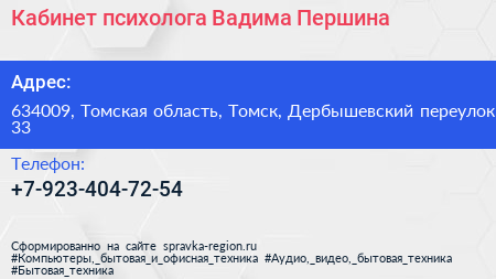 Кабинет психолога Вадима Першина по адресу 634009, Томская область, Томск, Дербышевский переулок, 33 в дальнейшем Организация, размещена в следующих категориях: