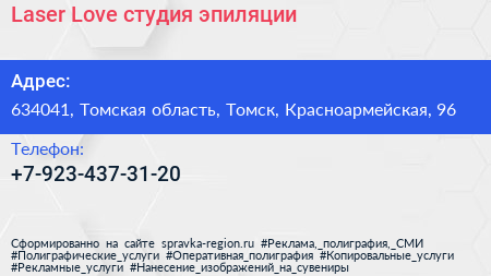 Laser Love, студия эпиляции по адресу 634041, Томская область, Томск, Красноармейская, 96 в дальнейшем Организация, размещена в следующих категориях: