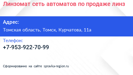 Линзомат, сеть автоматов по продаже линз по адресу Томская область, Томск, Курчатова, 11а в дальнейшем Организация, размещена в следующих категориях: