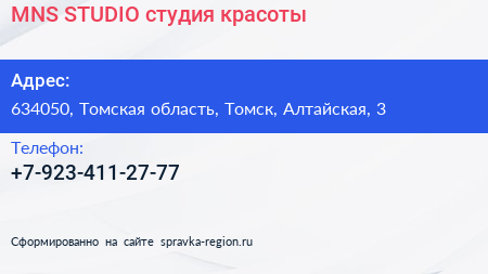 MNS STUDIO, студия красоты по адресу 634050, Томская область, Томск, Алтайская, 3 в дальнейшем Организация, размещена в следующих категориях: