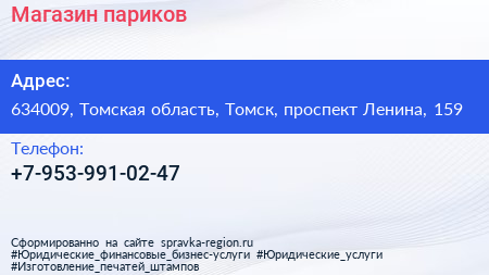 Магазин париков по адресу 634009, Томская область, Томск, проспект Ленина, 159 в дальнейшем Организация, размещена в следующих категориях: