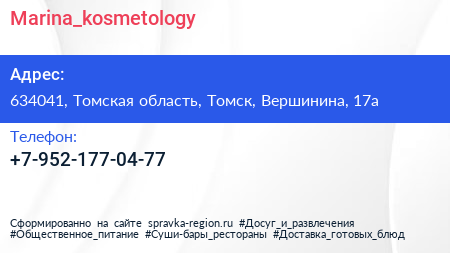 Marina_kosmetology по адресу 634041, Томская область, Томск, Вершинина, 17а в дальнейшем Организация, размещена в следующих категориях: