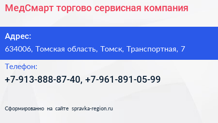МедСмарт, торгово-сервисная компания по адресу 634006, Томская область, Томск, Транспортная, 7 в дальнейшем Организация, размещена в следующих категориях: