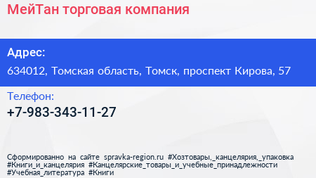 МейТан, торговая компания по адресу 634012, Томская область, Томск, проспект Кирова, 57 в дальнейшем Организация, размещена в следующих категориях: