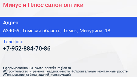 Минус и Плюс, салон оптики по адресу 634059, Томская область, Томск, Мичурина, 18 в дальнейшем Организация, размещена в следующих категориях:
