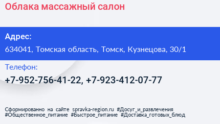 Облака, массажный салон по адресу 634041, Томская область, Томск, Кузнецова, 30/1 в дальнейшем Организация, размещена в следующих категориях: