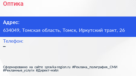 Оптика по адресу 634049, Томская область, Томск, Иркутский тракт, 26 в дальнейшем Организация, размещена в следующих категориях: