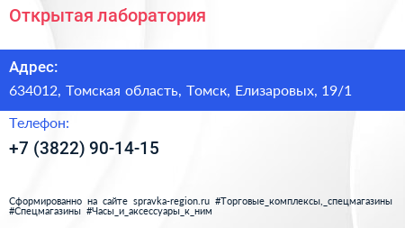 Открытая лаборатория по адресу 634012, Томская область, Томск, Елизаровых, 19/1 в дальнейшем Организация, размещена в следующих категориях: