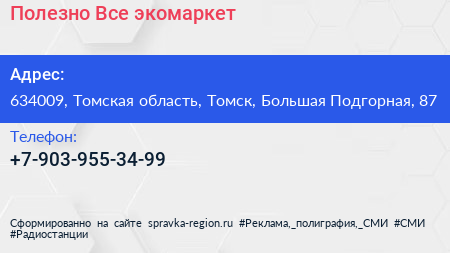 Полезно Все, экомаркет по адресу 634009, Томская область, Томск, Большая Подгорная, 87 в дальнейшем Организация, размещена в следующих категориях: