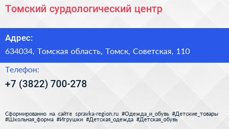 Томский сурдологический центр по адресу 634034, Томская область, Томск, Советская, 110 в дальнейшем Организация, размещена в следующих категориях: