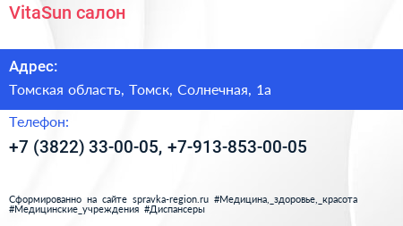 VitaSun, салон по адресу Томская область, Томск, Солнечная, 1а в дальнейшем Организация, размещена в следующих категориях: