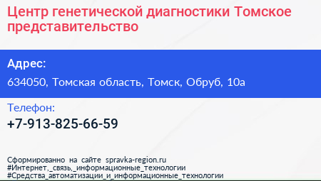 Центр генетической диагностики, Томское представительство по адресу 634050, Томская область, Томск, Обруб, 10а в дальнейшем Организация, размещена в следующих категориях: