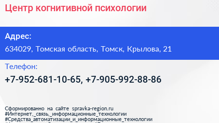 Центр когнитивной психологии по адресу 634029, Томская область, Томск, Крылова, 21 в дальнейшем Организация, размещена в следующих категориях: