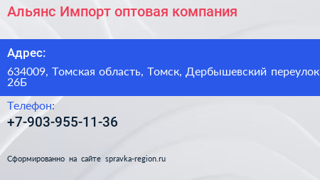 Альянс-Импорт, оптовая компания по адресу 634009, Томская область, Томск, Дербышевский переулок, 26Б в дальнейшем Организация, размещена в следующих категориях: