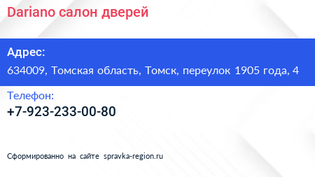 Dariano, салон дверей по адресу 634009, Томская область, Томск, переулок 1905 года, 4 в дальнейшем Организация, размещена в следующих категориях: