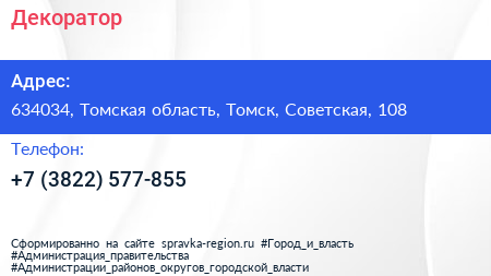 Декоратор по адресу 634034, Томская область, Томск, Советская, 108 в дальнейшем Организация, размещена в следующих категориях: