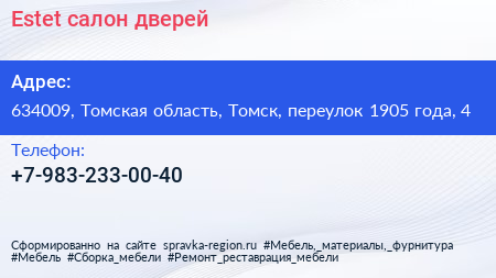 Estet, салон дверей по адресу 634009, Томская область, Томск, переулок 1905 года, 4 в дальнейшем Организация, размещена в следующих категориях: