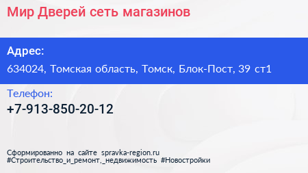 Мир Дверей, сеть магазинов по адресу 634024, Томская область, Томск, Блок-Пост, 39 ст1 в дальнейшем Организация, размещена в следующих категориях:
